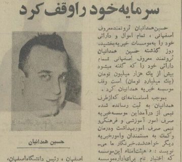 تیتر روزنامه اطلاعات نهم اردیبهشت 1354: همدانیان هزار میلیون تومان سرمایه خود را وقف کرد